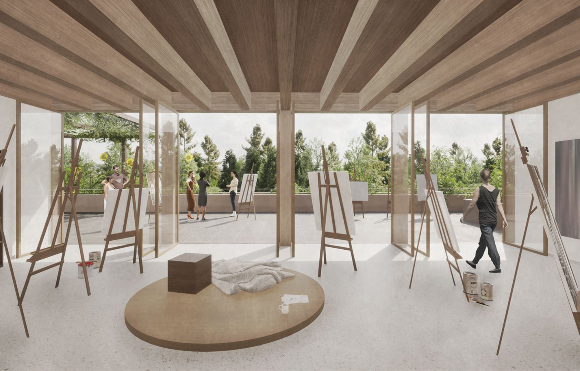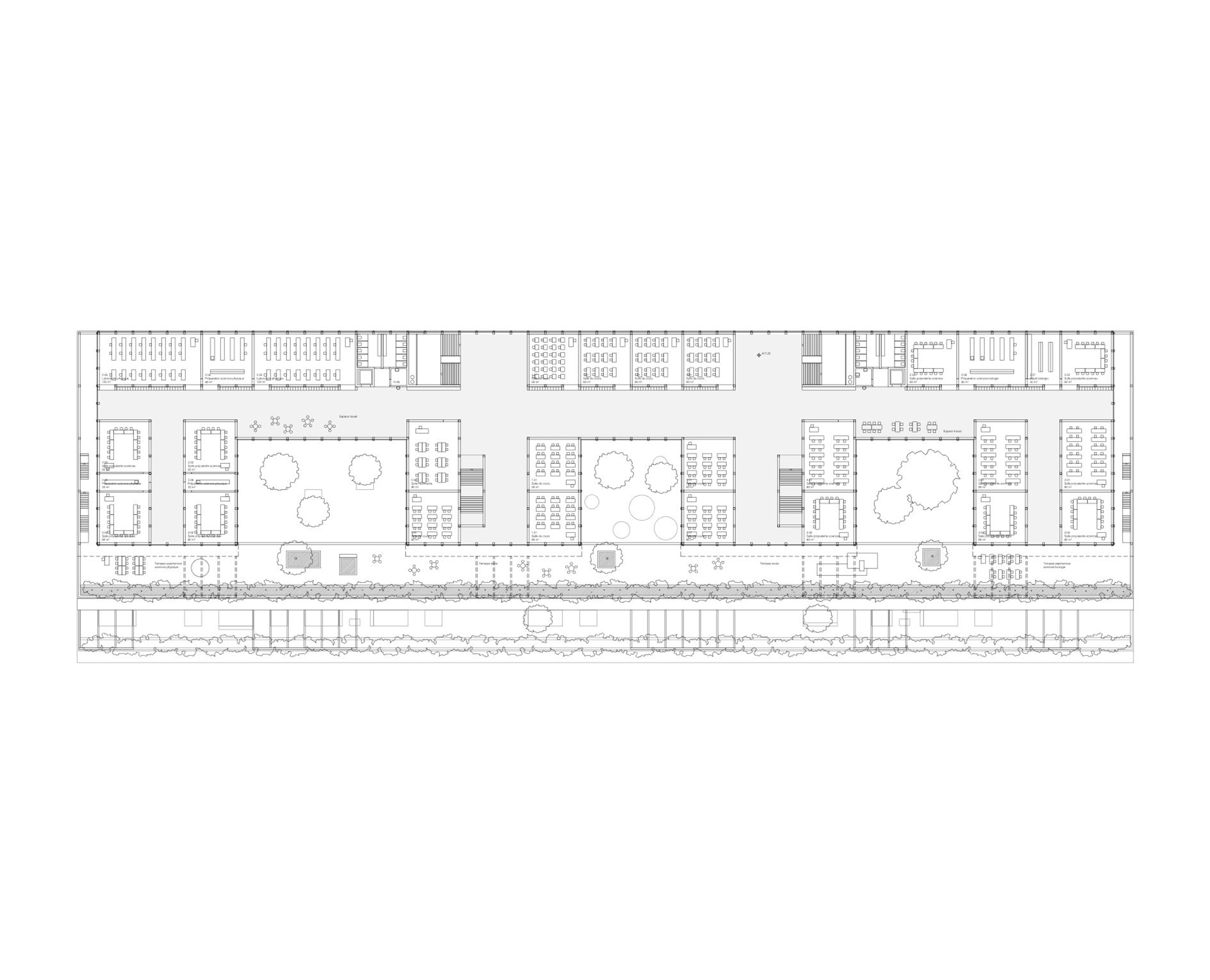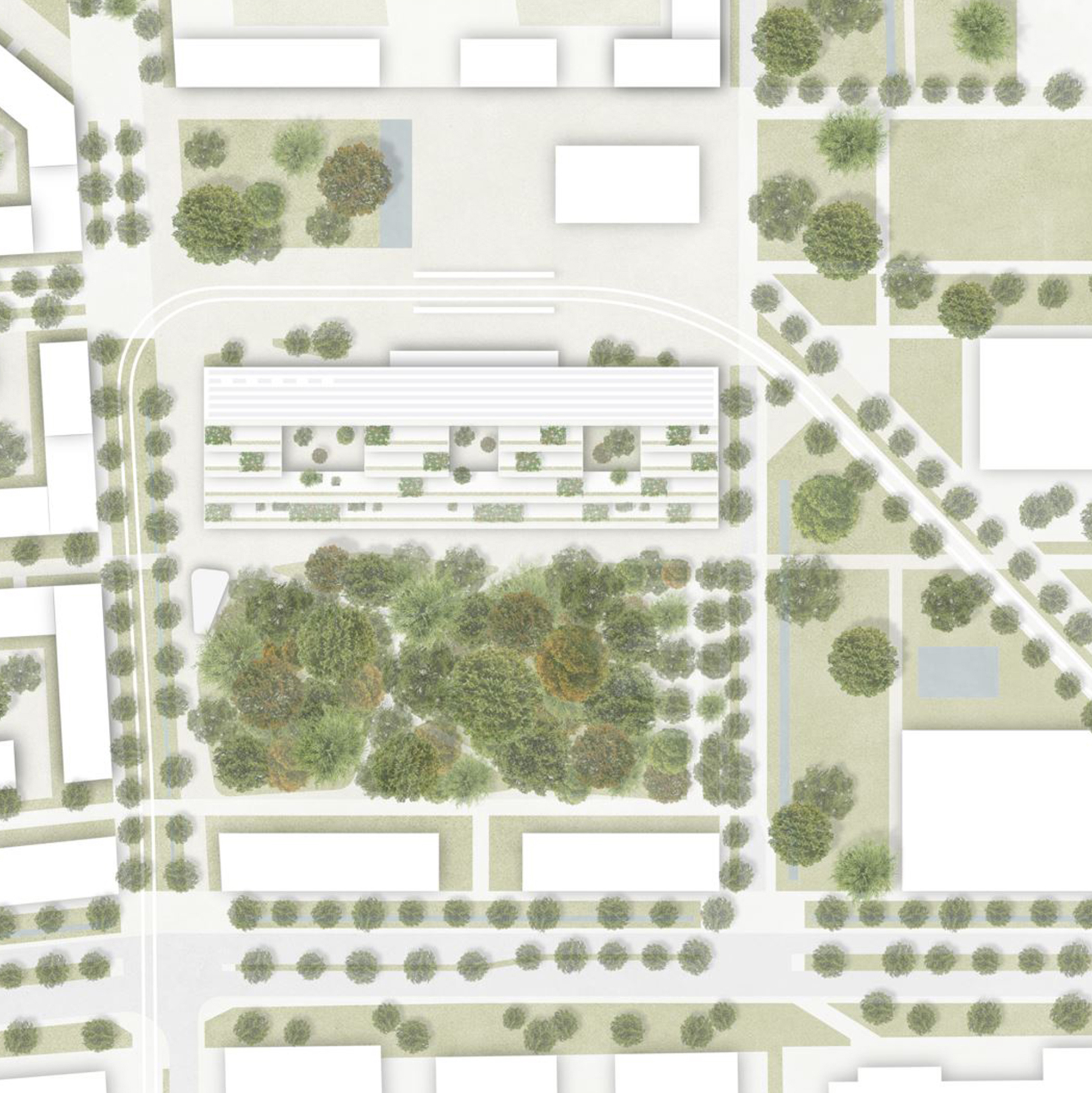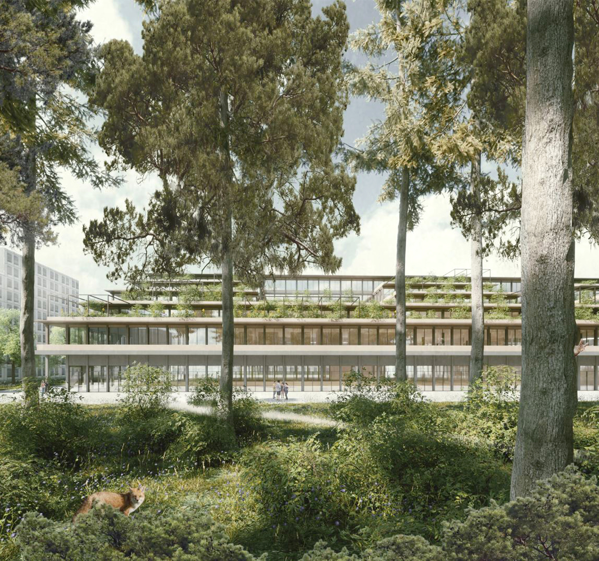 Le projet Pomme de Pin s’implante en lien direct avec la place des Cherpines et l’arrêt de tram, renforçant les espaces publics voisins. Il libère au sud une zone de pleine terre pour une forêt dense reliée aux jardins de l’Aire, améliorant biodiversité et confort.